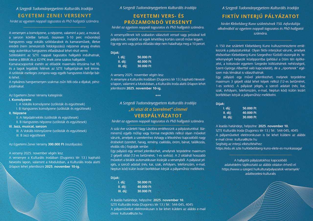 A Szegedi Tudományegyetem Kulturális Irodája egyetemi zenei versenyt, egyetemi vers- és prózamondó versenyt, verspályázatot, valamint fiktív interjú pályázatot hirdet Klebelsberg Kuno születésének 150. évfordulója alkalmából az egyetem nappali tagozatos és PhD hallgatói számára.