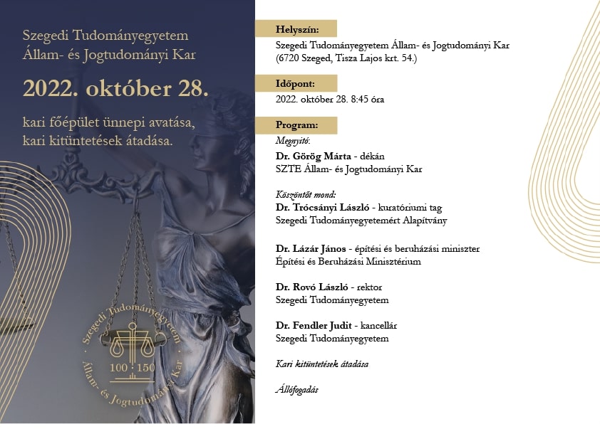A Szegedi Tudományegyetem Állam- és Jogtudományi Kara a 2022/23. tanévben emlékezik alapításának 150. évfordulójára, mely alapítás a Magyar Országgyűlés által történt 1872 októberében – Kolozsvárott. Az 1882-től Ferencz József nevét viselő állami egyetem 1919-ben, a trianoni békeszerződés megkötése előtt elhagyni kényszerült a kincses várost, Erdély kulturális fővárosát, hogy kétévnyi útkeresést követően végül 1921-ben az egykori Délvidék kapujában találjon új székhelyre – Szegeden.